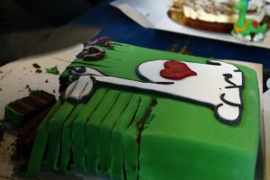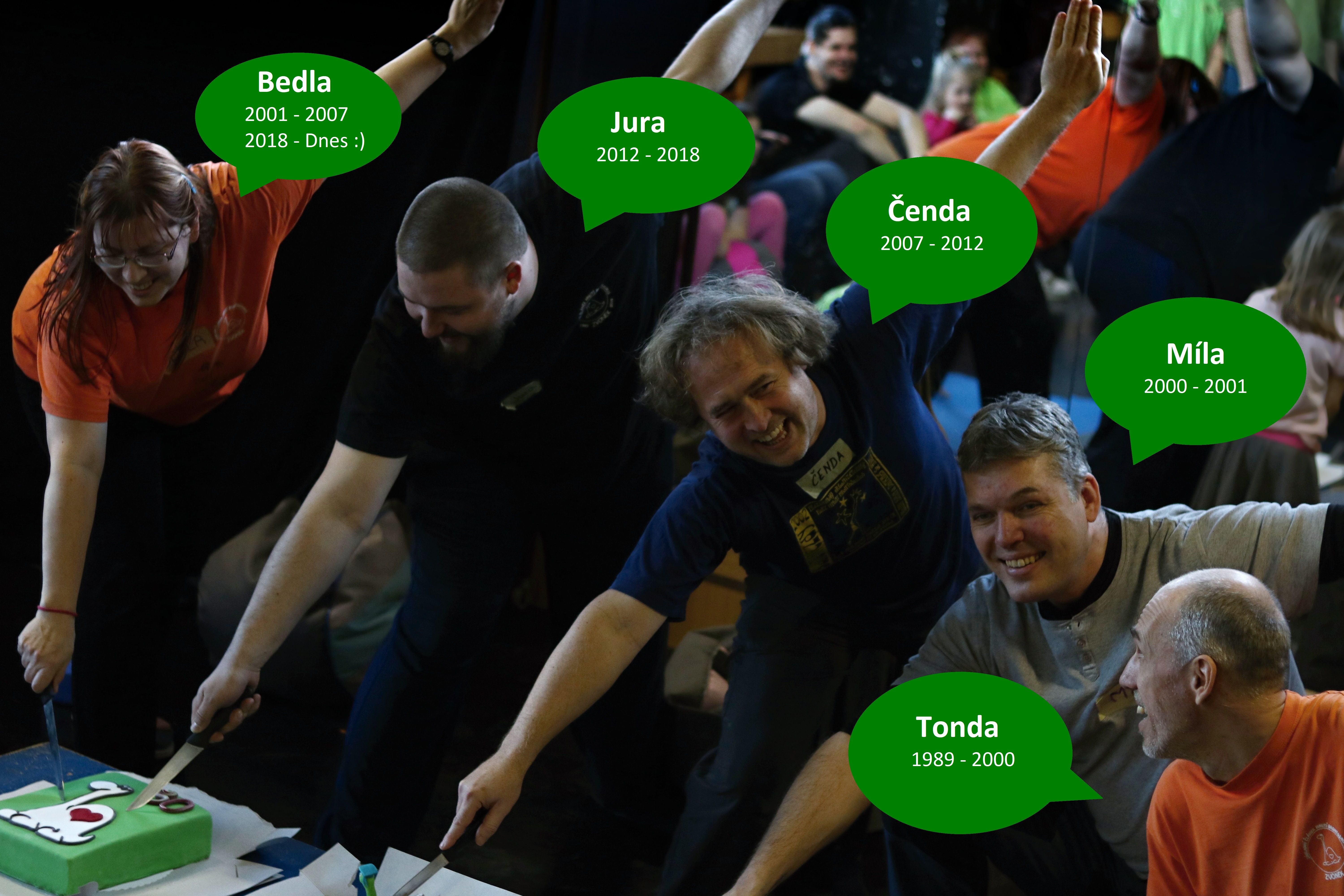 Popri tej zachránenej sa objavilo ešte viacero tort, pretože jedna by takému množstvu oslavujúcich rozhodne nestačila. Na každej torte trónil originálny zvonkovský brontosaurus so srdiečkom na boku. Krájení dorů bylo výsostné právo předsedů z celé historie Zvonku. – pozn. redaktora:)