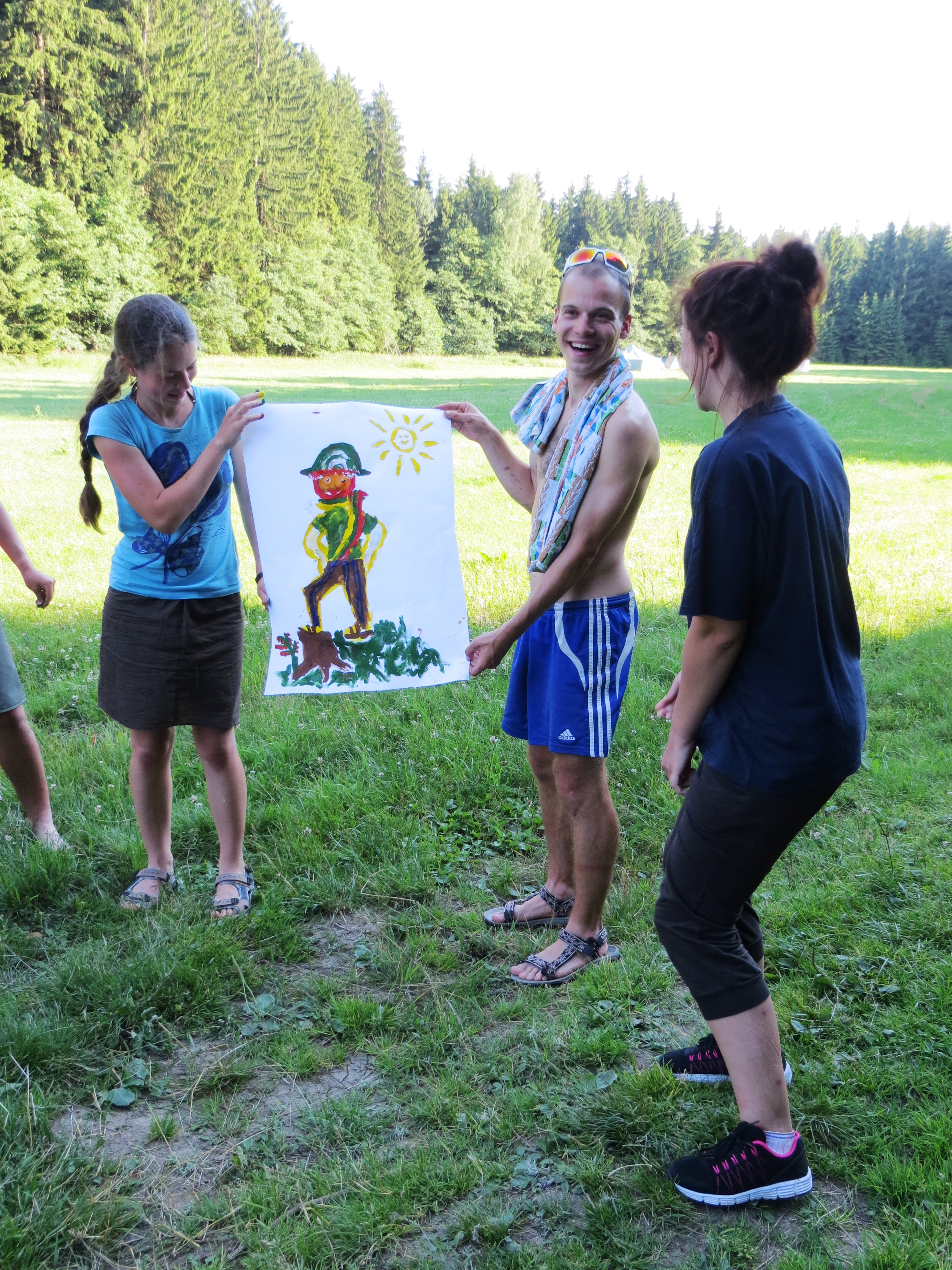 polední klid (pocitově odpolední) poté kresba – portrét mytága narcise (u lesa) formou hry. Vzápětí výlet k rybníku Vidlák – koupání.