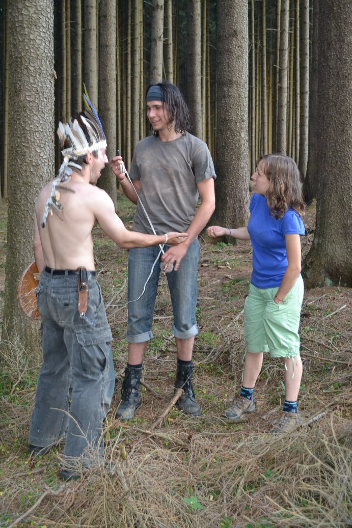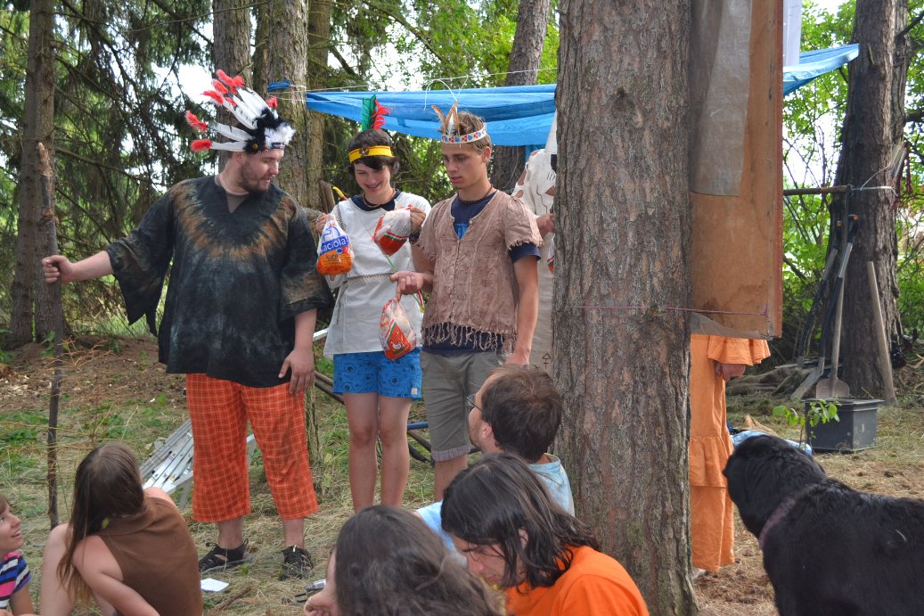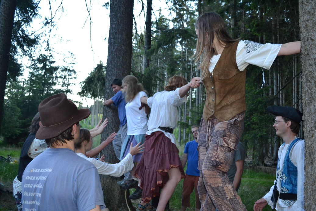 Skaut! Velkej, ležící a křičící skaut. Aha. Tak ne skaut, ale detektiv. Ženská, co je vlastně chlap. Sejmulo ji obří mytágo. To je asi něco jako hovado, jen mnohem větší. Prej, že už tam ten detektiv leží několik dní. Chudák, říkám si. Škoda, že nemáme síly na to mu pomoct. Anebo máme? Někdo se hrne dopředu mu pomoct. To jsem teda zvědavej, co to bude za blázna. No jasně! Blonďák! Kdo jinej taky, že jo. Tak to nakonec celý dopadne tak, že se s báglama na zádech taháme s ženskou, co je vlastně chlap, i když to nevypadá, ale rozhodně tak váží. Tak hurá do tábora! Anebo ne? Jasně že né. Hledáme bednu v díře. Musíme do ní dát mobily wedding jumping castle. Problém je v tom, že díra z bednou vypadá jako drn na louce. Hledáme teda drn na louce. Detektiv nejspíš blouzní, pač nemá vůbec šajnu, kde to je. Nakonec bednu najdem a mobily do ní vrhnem. To vše samozřejmě s báglama a detektivem na zádech. Razíme do tábora. Vybíhají dva týpci a jedna ženská. Ženská křičí. Chlapi nesou nosítka. Jeden vypadá jako námořník, druhý zas jako pirát. Nakládají tu tíhu a odnášejí. Konečně v táboře!