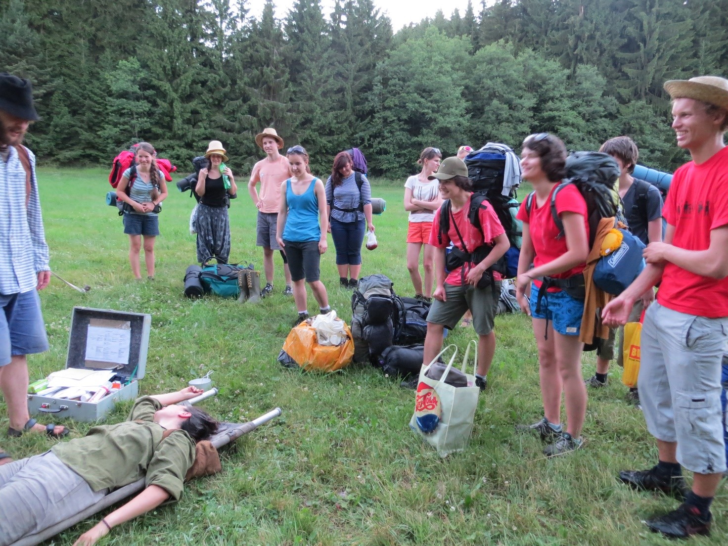 Balíme na cestu k loukám. Jako vždy vymustrováni, vyzbrojeni lahvemi a pláštěnkami. Samozřejmě nám nechybí ani kosící náčiní.