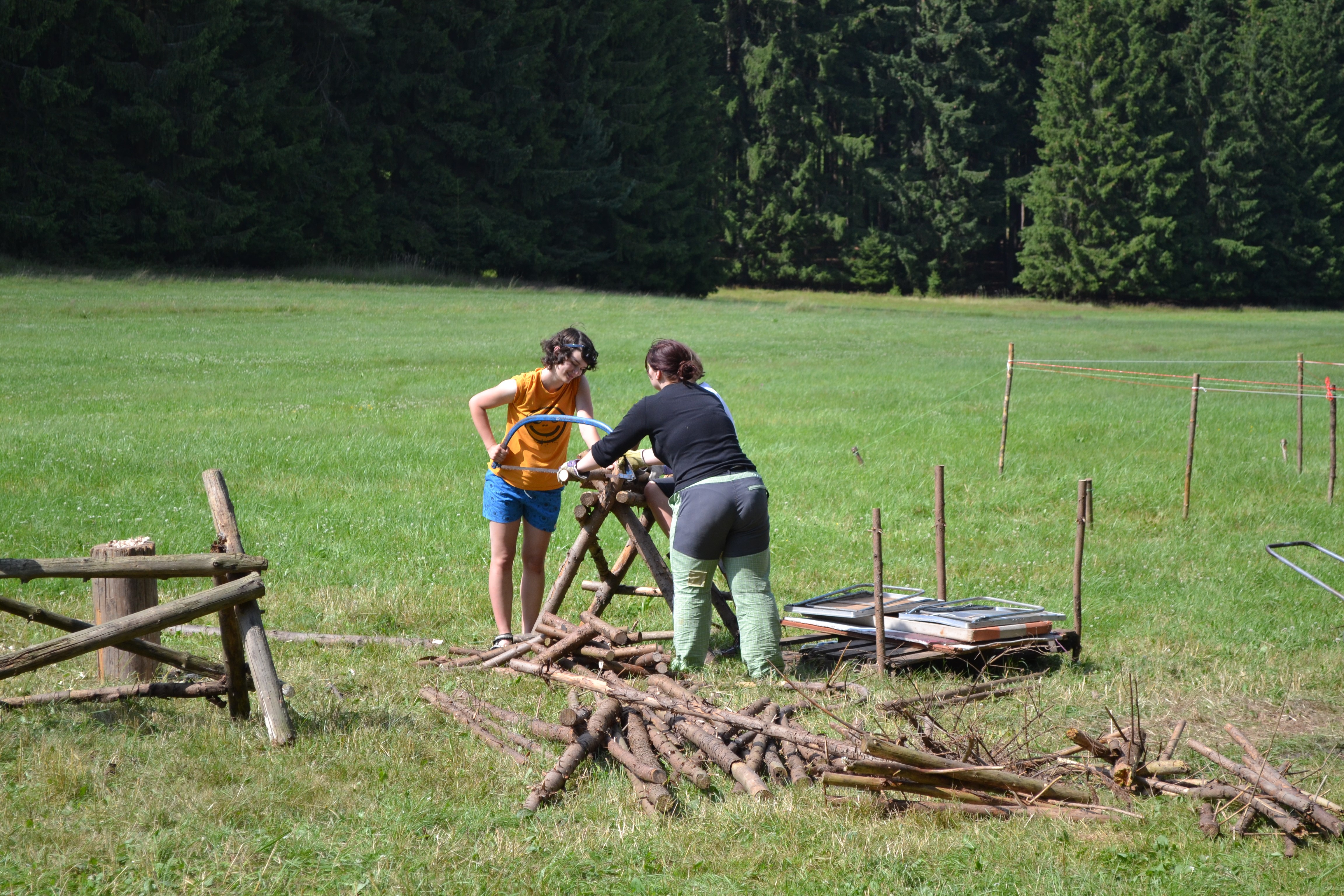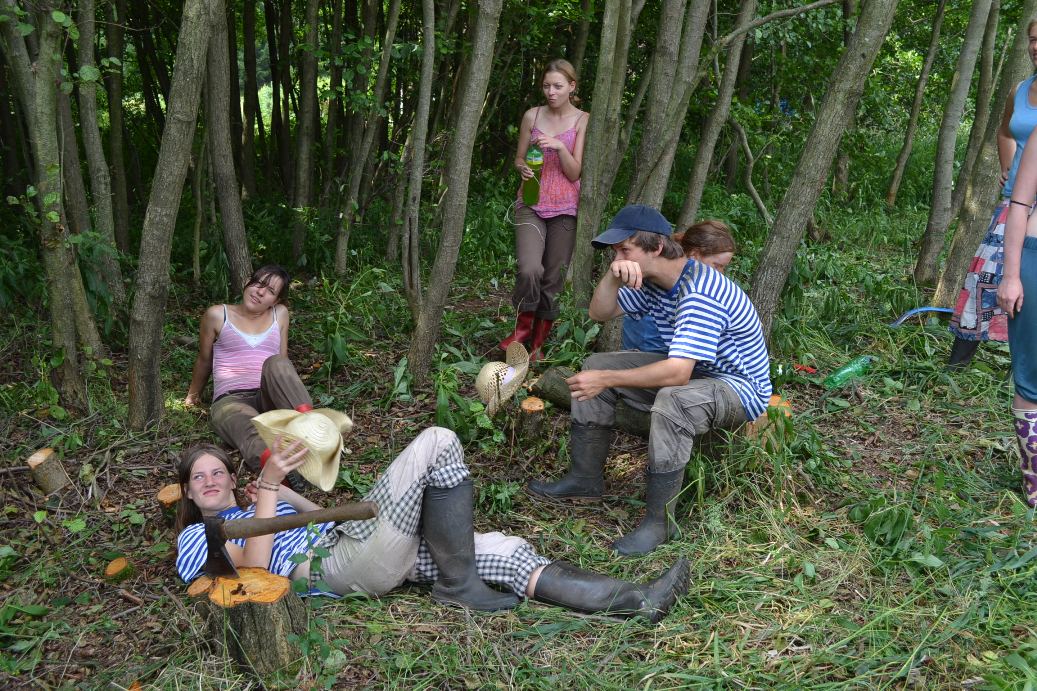 V plné práci nás zastihla služba (Thea a Arsenij) se svačinou. Ukusujíce dřevorubecké chleby jsme odpočívali. Postupem dopoledne se začalo oteplovat a občas se ukázalo i sluníčko. Hezké.