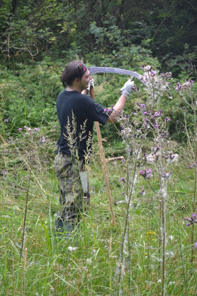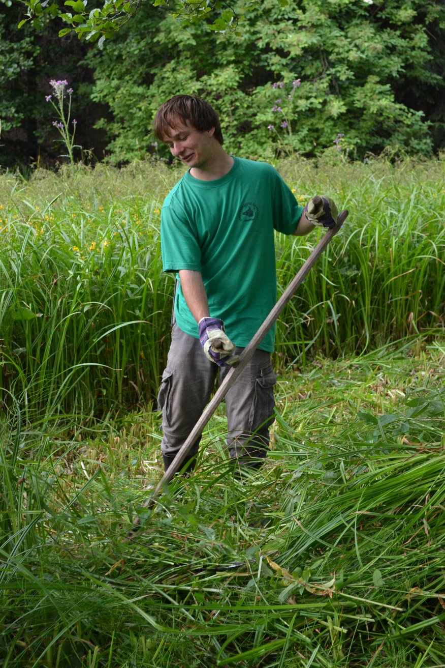 Jdeme kosit zbývající cíp od louky, kterou jsme kosili včera. Pirát opět hlučí s křoviňákem a my se snažíme s kosami. Každý svým stylem a rychlostí ukusuje díl po dílu vysokou trávu louky a jde nám to. Tráva si lehá s ochotou jak kde, ale dobrý většinou. Někde se jedná o takové kosmetické úpravy mechů a někdy se to zdá horší.