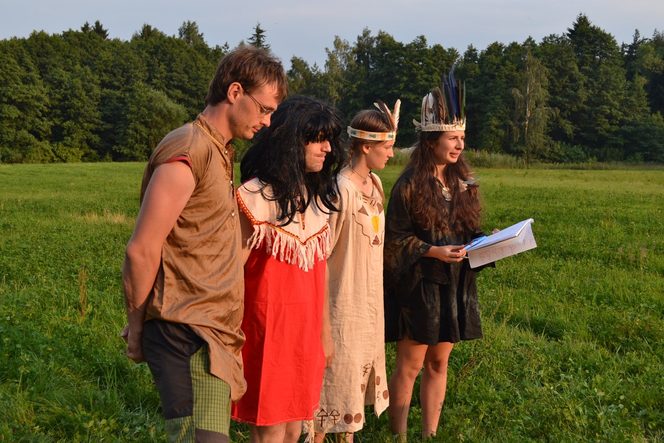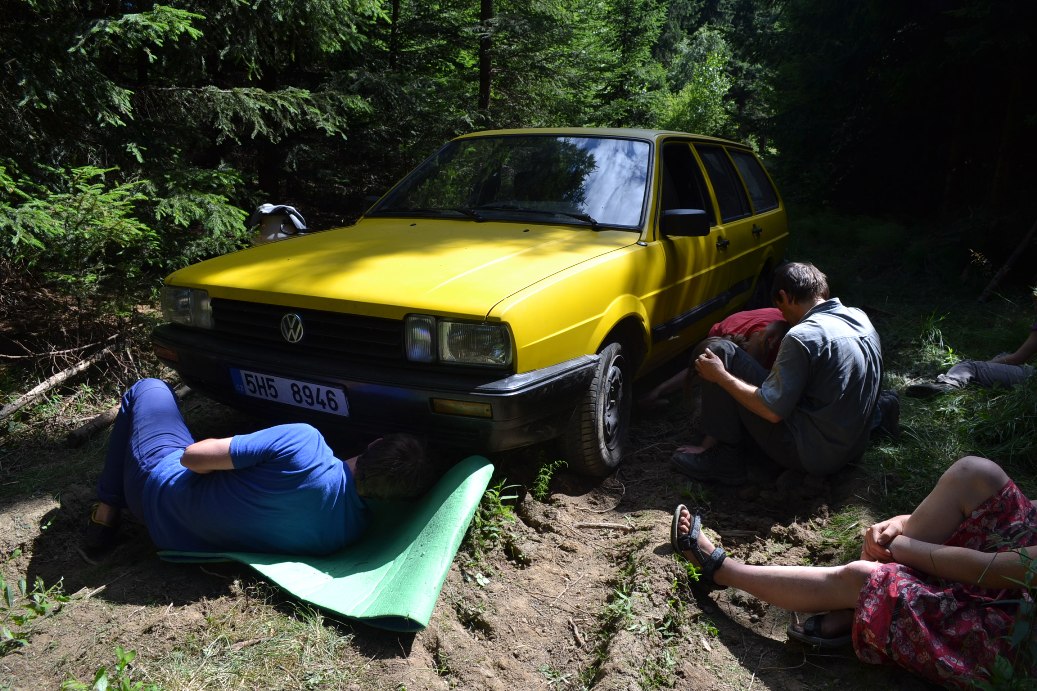 Stojíme na nádraží. Někteří sedí. Blonďák kupuje lístky. Lezem do vlaku. Lezem z vlaku. Blonďák čte dopis. Jdeme za ním. Vede nás tunelem do kopřiv. Začínáme se seznamovat. Bude se to hodit, abychom mohli volat o pomoc jménem. Třeba když přelézáme rozbahněnou řeku. Jdeme. Jdeme na kopec… Odpočíváme. Je vedro a batohy jsou těžký. Teda jak asi pro koho. Tři slečny jdou jak ze školy. Batůžek, sandálky a brejličky proti sluníčku. Dobrý ale je, že mají i řízeček. Hodně řízečků. Jdeme. Jdeme. Les. Slečna, co už tu prý několikrát byla a co prý má mezi vedoucími bráchu a co prý všechno ví, říká, že už tam za chvíli budem. Během následujících hodin to slyšíme několikrát. Během cesty se ještě stihneme ztratit, rozbít marmeládu a potkat mluvící labutě. Když už se nakonec opravdu blížíme k táboru, máme všichni dost a sil máme na dně. Když tu najednou!