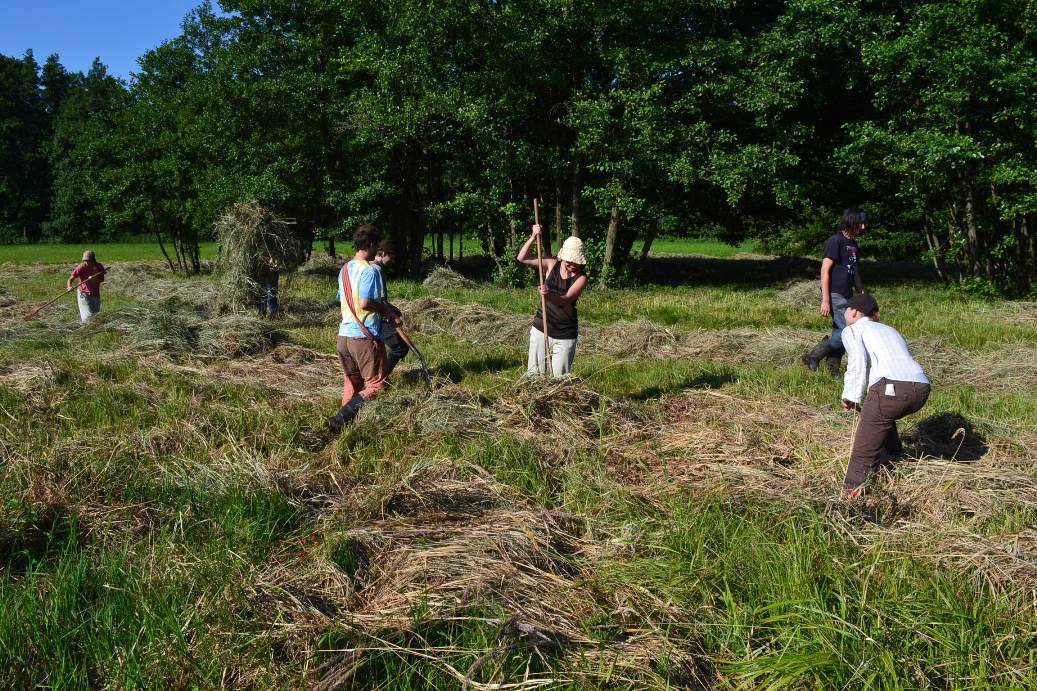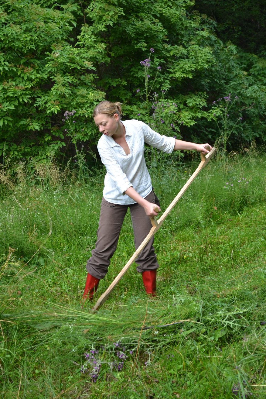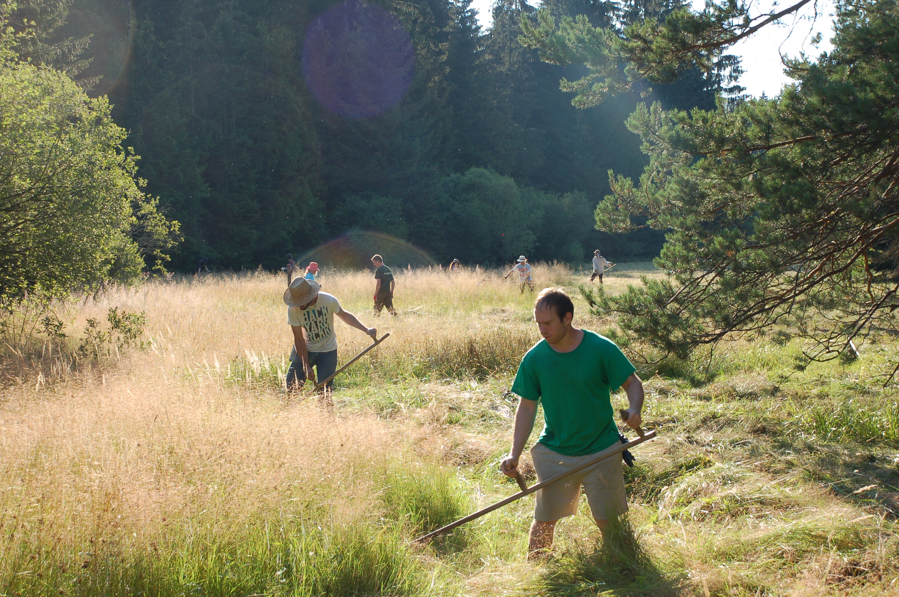 Ráďa nás nakonec namotivovala, že když dokončíme určitý kus louky ještě, tak půjdeme ku obědu. Tempo kosení se tedy trochu zrychlilo, ale následně přišel Jirka, že je zbytečné tento díl louky obdělávat, jelikož by se jednalo už spíše o takovou kosmetickou úpravu. S velkou nevolí od této práce upouštíme. Jirka některé z nás musel od kosení z louky násilím tahat dokonce.