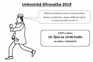 Přijďte si protáhnout nohy a mozkové závity! Musíte rozluštit šifru, abyste věděli kam dál jít a možná dorazíte i do cíle 🙂 START v sobotu 19. října ve 14:00 hodin na návsi v Unkovicích Unkovická šifrovačka 2019 – leták Přihláška Luští se v týmu 1-4 dětí. Alespoň některé děti v týmu by měly umět číst. Každý tým doprovází dospělá […]