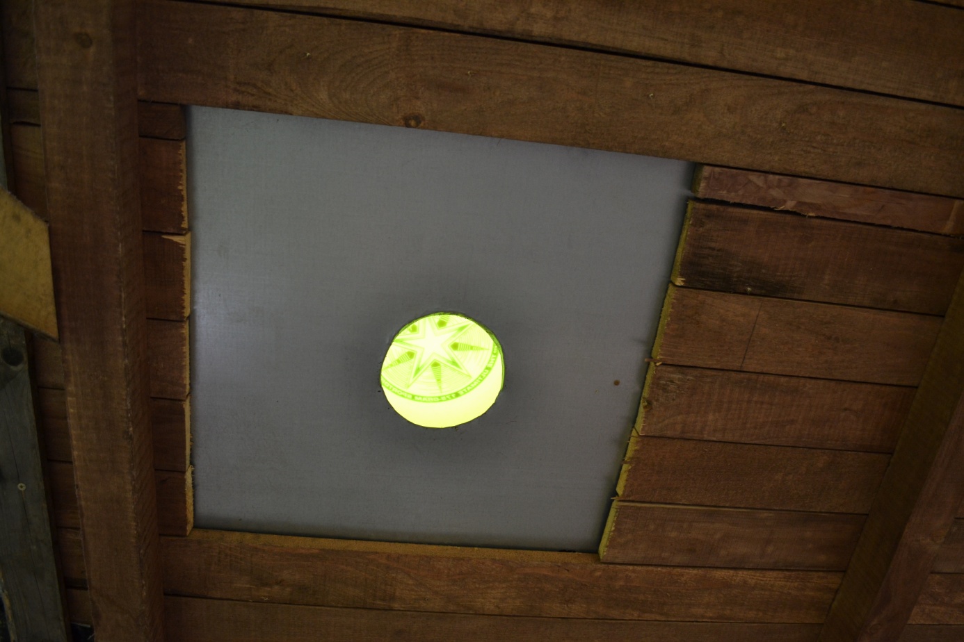 Po dokončení všech prací a odjezdu většiny lidí jsme si chtěli zahrát frisbee. Trénovali jsme mimo jiné i házení dvou talířů najednou (poměrně snadné), chytání dvou talířů (těžké) nebo chytání talíře v sedě (velmi těžké). A někdo hodil talíř tak šikovně, že přistál na střeše – přímo na otvoru pro komín!