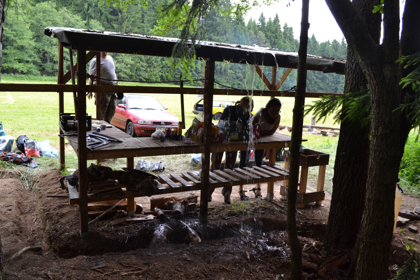 A jinak už se jen pracovalo, pracovalo a pracovalo. Vytvořili jsme nový můstek, vyčistili jsme potůček za kuchyňkou a vykopali odvodňovací kanál, který jsme na konci víkendovky také odzkoušeli. A fungoval dobře 🙂